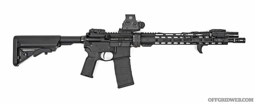 Since the gas tube rotates within the lock collar, the handguard needs to be circular-ish on top to clear it. Many slimmer handguards have a square channel for the gas tube that won’t work. For the DIY kit, you can choose from handguards with and without a top rail from Pantheon or other roomy options from companies such as Rock River Arms, YHM, and Unique ARs.