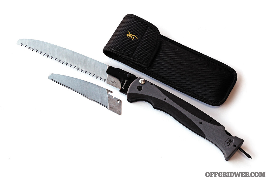The Speed Load Saw is half folding knife, half pole saw. It combines the teeth, extension, and functionality of the latter with the portability of the former. The goal of this tool is to have a powerful camp and big-game saw that’s simple to use, quick to pack up, and easy to stow. For example, you can use it to cut tree limbs to build a shelter or to process a kill that’s too heavy to drag back to basecamp whole. And using its locking wood screw on the butt-end of the handle, you can connect it to a right sized branch to turn it into a high-reaching pole saw. The saw comes with a nylon belt sheath, which has sleeves for storing the included extra blades.