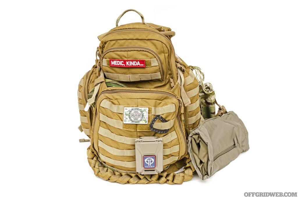 Side storage pockets hold a titanium 20-ounce Snow Peak cup and lid, a handful of instant coffee packs, a Jet Boil with extra can of fuel, and an extra broken down MRE main meal.