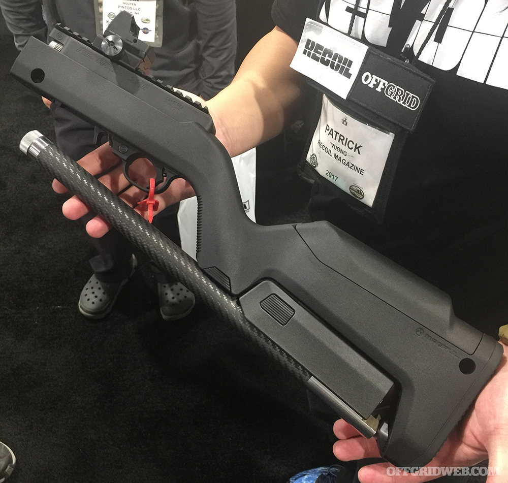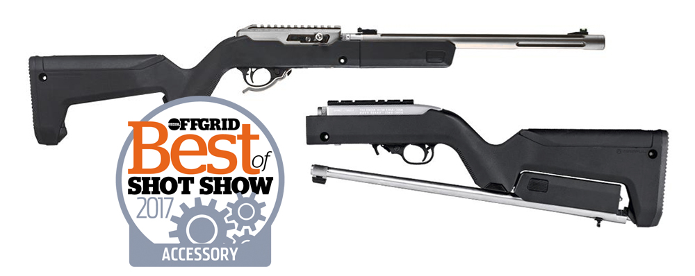 The MAGPUL X-22 Backpacker also incorporates two storage compartments: one under the cheek piece for three 10-round spare magazines or a box of ammo, and one inside the grip for a ferro rod, small knife, fishing kit, or other survival tools. It will be available in spring 2017 in black, FDE, OD green, and stealth grey colors. MSRP is $110.