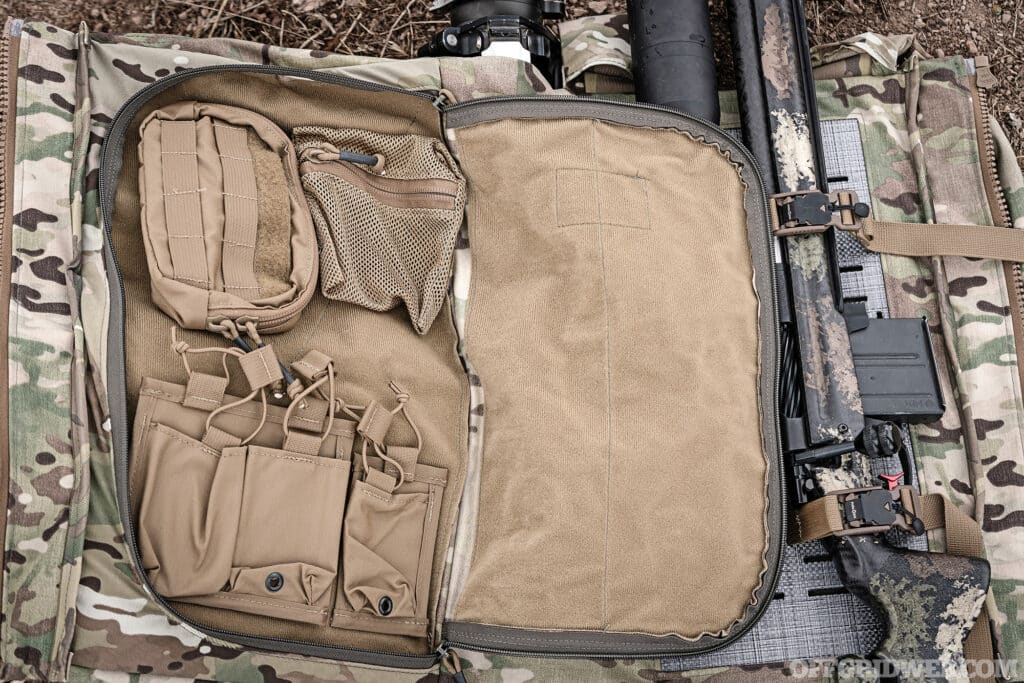 Opposite the Tegris panel is a zippered compartment lined with hook-and-loop material for any number of optional pouches for magazines, a Kestrel, or various sizes of additional organizational bags that are easily organized to each user’s requirements and removable when needed. Once set up, strapping your rifle to the pack and closing it up is a simple affair if you’re at all familiar with basic clips and zippers, and if conditions dictate a hasty exit, you can simply strap your rifle in, fold the pack closed, grab the two handles on the right side and go. Once the pack is closed, two main front pockets are obvious, roomy, and incorporate more loop liner for additional pouches, dividers, or just a soft environment to protect things like binocular optics. The lower pocket has an external MOLLE panel sewn to it, which I used to attach an IFAK so it’s as obvious and accessible as possible to everyone when I’m out instructing. On the left exterior of the pack is a water bottle sleeve. However, thanks to the two pack cinch straps located above it and the pack’s rugged material selection, this sleeve can easily be used to carry a tripod, and I found that I often do. Both pack models include provisions for CamelBak-style hydration bladders, so there’s no anxiety about using water space for tripod carrying.