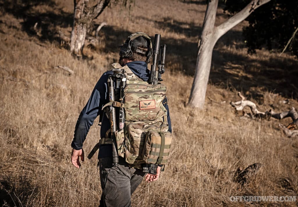 Coming from a larger scabbard-style backpack to the Skili Gear made me reevaluate some gear choices. This process highlighted how much extra I had been carrying that I had never used or was redundant. As an instructor, I never felt like I was missing something I couldn’t fit into this pack. I was grateful for the reduced bulk while moving through the brush and between shooting positions. Rifle deployment was quick and simple due to the reduced overall bulk of the pack. At times, the pack offered a simple solution to use as a shooting bag off tree limbs or rocks. The internal aluminum frame retained its usefulness when stood vertically as a rear rifle support as well.