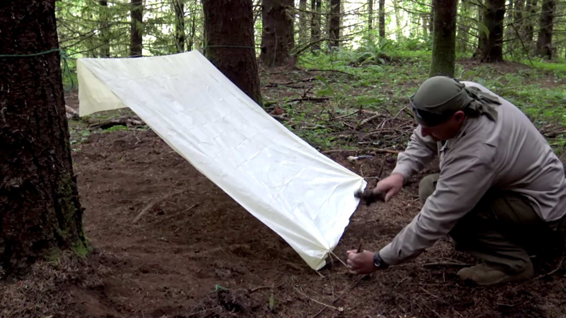 Speaking of cordage, the jute is a solid choice. It can be braided into rope, as Cpl. Kelly shows, or can be shredded and used as tinder. It also provides a way to suspend the shelter, which is a humble PVC shower curtain. That may sound ghetto, but it’s designed to repel water, so while it’s not the most durable item, it’ll keep you dry.