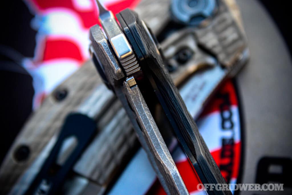 Both the titanium lock side and the scale on the “show side” have a deep laser engraved texture pattern that provides excellent grip, especially beneficial when working in wet conditions. There is a ramp on the spine which provides a comfortable place for your fingers to sit when using the knife. The first third of the ramp has jimping provide traction to reduce the possibility of your finger slipping off. The flipper tab also has jimping to ensure there is no finger slip when attempting to open the knife.