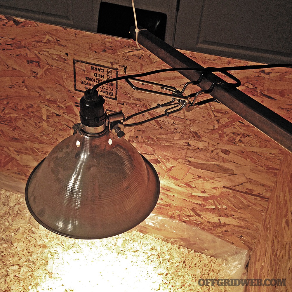 Take a piece of tubing and attach it to the top of the tub with cable ties to attach the heat lamp to. It doesn’t need to be steel or even metal; any piece of wood or dowel will work. Attach it to the center or closer to one end, wherever is easiest and most secure. Do this so the light can be adjusted to be closer or further away from the chicks by rotating it up or down. When chicks are smaller, the light needs to be closer to produce more heat. When they’re bigger, the light needs to be higher so they can move around freely.
