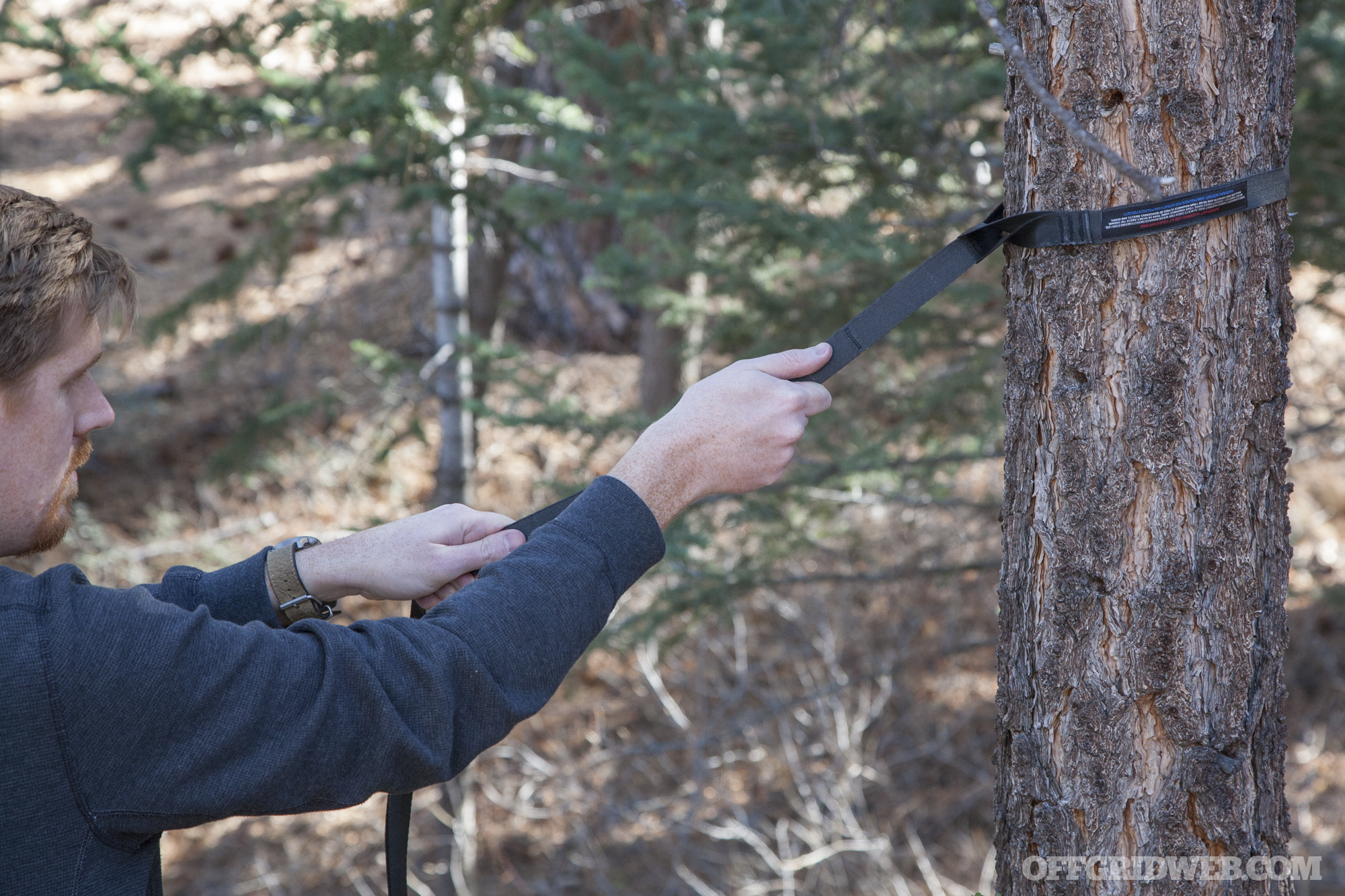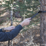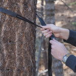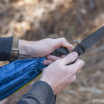 Loosening the drawstring on the stuff sack, we turned out its contents and began setup of the tree straps. Each strap unrolls to 11 feet long, and the hammock itself is a little over 9 feet long, so we found two sturdy trees that were about 20 feet apart. Any time you sleep under trees, it’s wise to ensure there are no “widowmaker” branches or other pieces of dead wood which might fall onto you in the night.