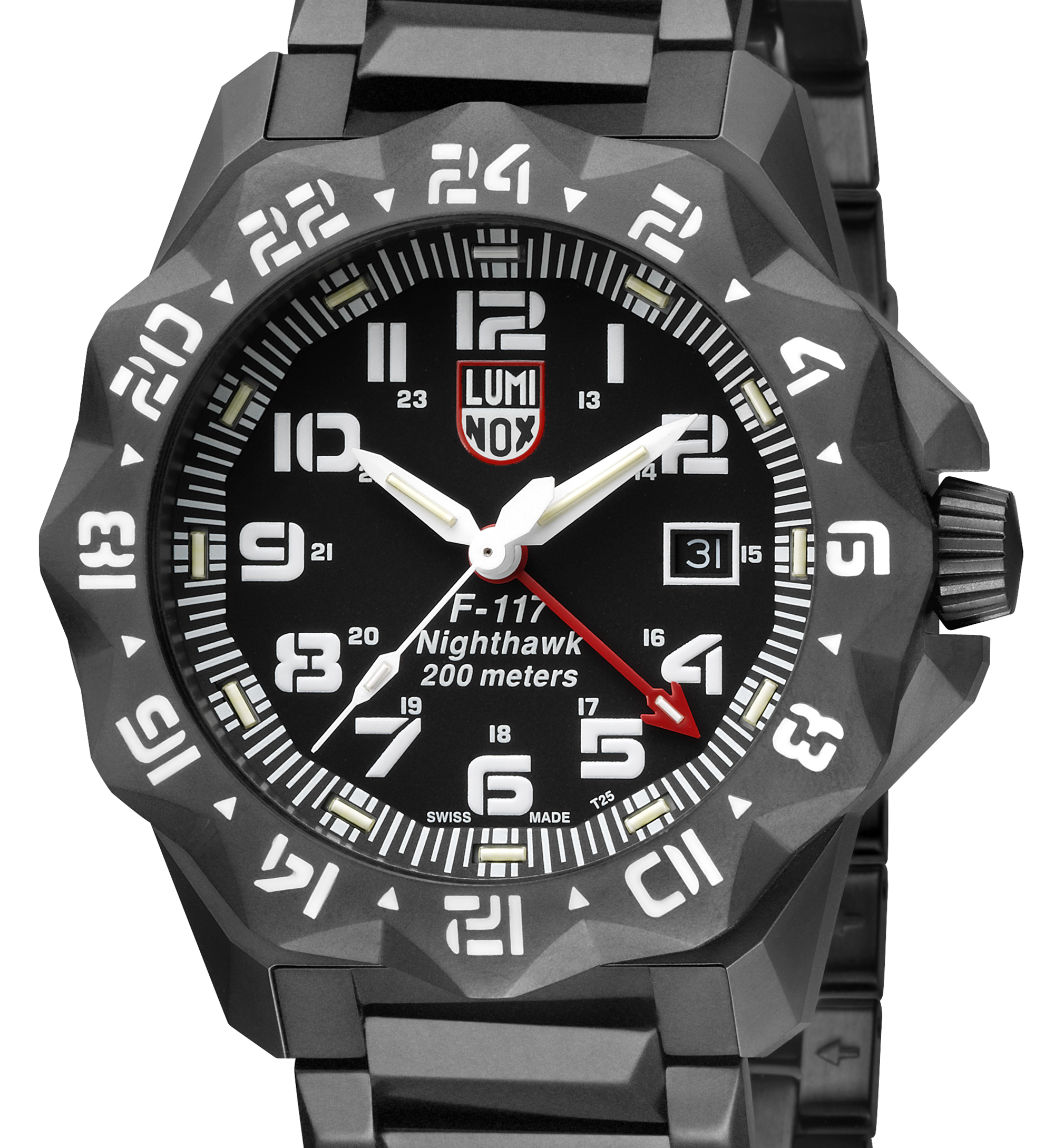 Next up in the line of new Luminox watches is the F117 Nighthawk series. These watches are offered in two models, the 6421 with a nylon band (above right), or the 6422 with a stainless steel bracelet (above left). Both are 45mm with quartz movement and offer a secondary time zone function for frequent flyers. The 6421 retails for $1,000, and the 6422 retails for $1,400.