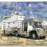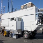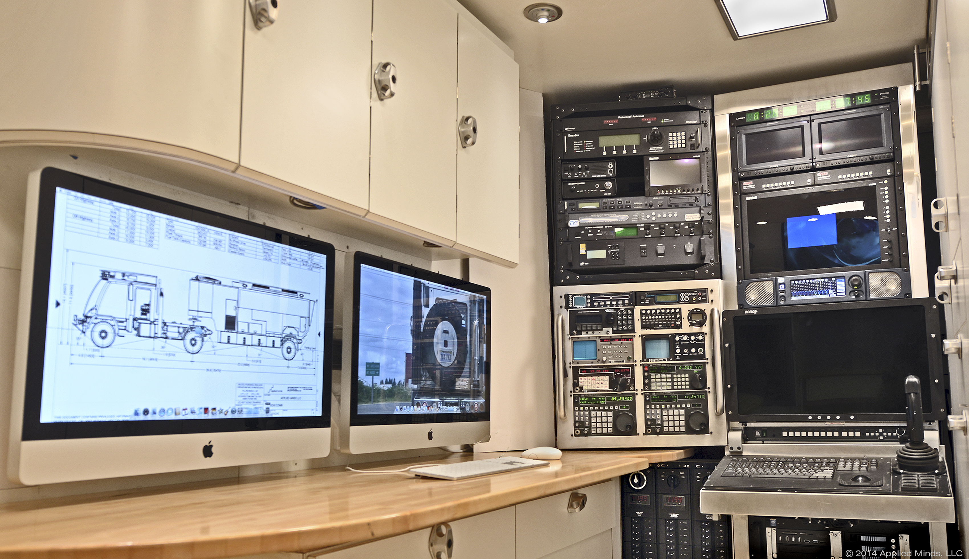There are several servo-controlled pneumatic masts atop the tractor and trailer, which extend to provide added antenna reception and broadcasting capabilities. One of the masts contains an array of electro-optical cameras, including high-def video, still photography, FLIR infrared, night vision, and even a laser rangefinder. There’s even a SATCOM for Internet connectivity and video conferencing.