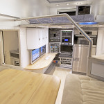 The KiraVan’s trailer is a stark contrast to its high-tech trailer cab. There’s wood flooring, a full kitchen, a 4K HDTV with surround sound, a dining area, and an office with dual Apple computers. On the upper level (yes, there’s an upper level) you’ll find a main sleeping loft and a pop-up “penthouse” designed specifically for Kira. The trailer’s bathroom includes a shower with a multi-faceted skylight, and a toilet that incinerates all waste into a non-toxic and sterile powder. Ferren says the trailer contains enough food, water, and provisions to support the crew of three comfortably for 3 weeks without re-supplying.