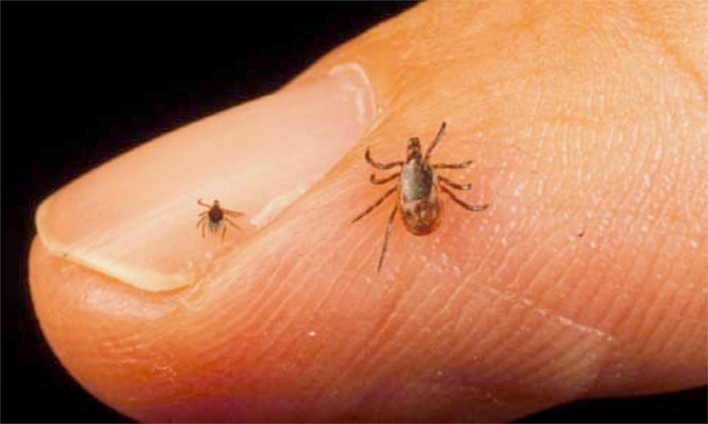 A graph of tick activity based on life cycle stage. Nymphs and adults feed on humans; larva feed on smaller animals....