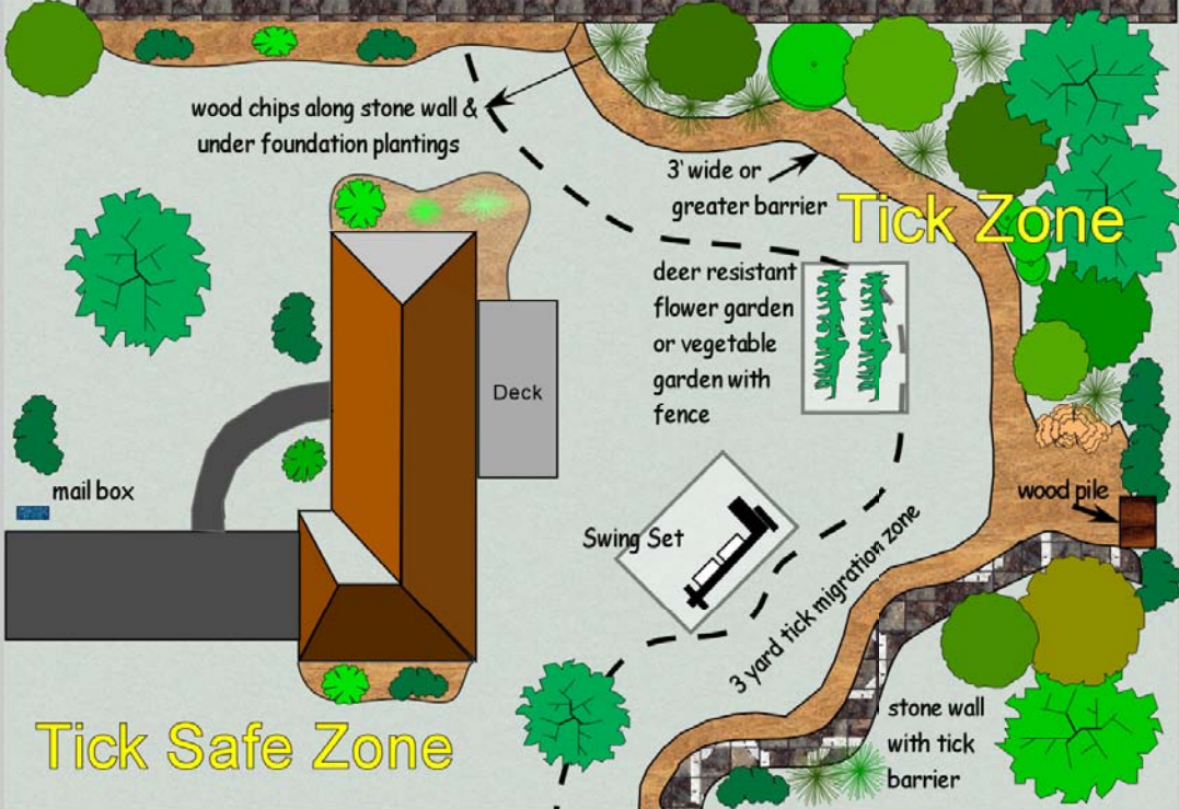 If a tick is found on your person, and has already bitten you, follow our guide on safe tick removal. Preventative measures should also be taken around your home to prevent ticks on your property or in your yard. Here’s a helpful CDC map that shows how to structure your property with a 3-yard migration barrier between wooded areas and heavily-traveled areas: