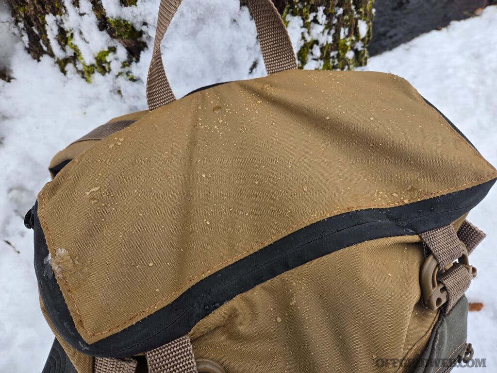 The main compartment is accessed from the top zipper panel and there is one zipper pocket on the front of the pack. Both zippers are highly water resistant YKK zippers. The zippers and Cordura make the Discovery M1 a reasonably water-resistant pack and will keep the survival kit gear inside dry through light rain and snow and will buy you some time to find a dry spot if caught in a heavier rainstorm.