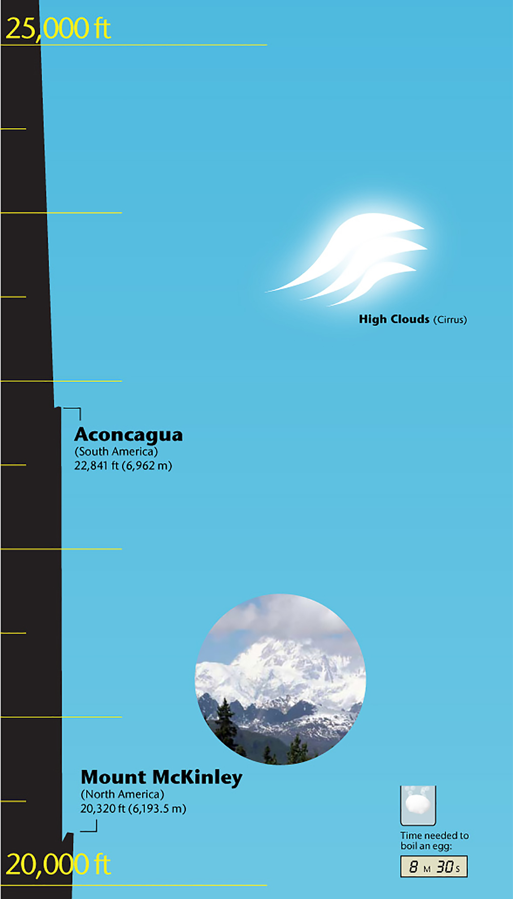 The following infographic from LiveScience illustrates the landmarks of planet Earth from top to bottom. It also points out facts such as atmospheric pressure, temperature, and boiling time. Click here to download a full-size version of this infographic.