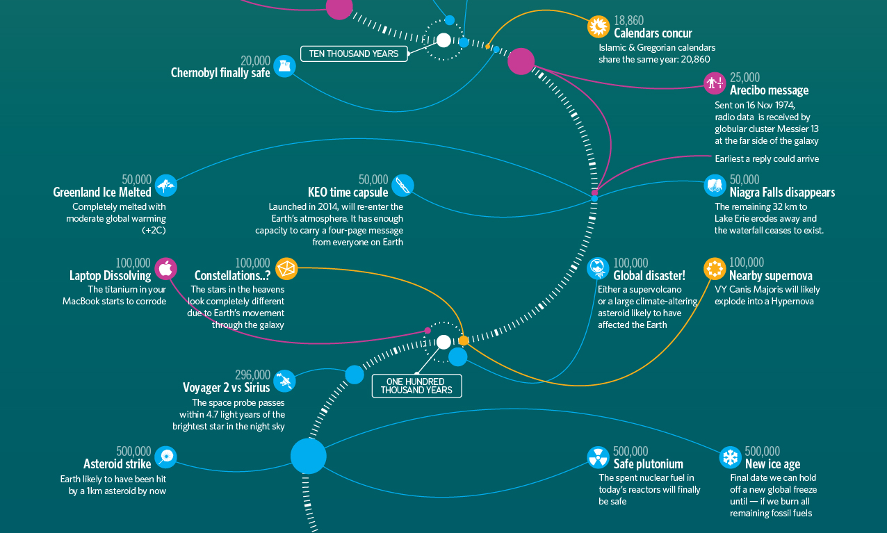The following infographic from InformationisBeautiful.net compiles predictions from NASA, Britannica, Scientific American, and other publications to create a timeline of the distant future. Some of these events are based on extrapolating progressions at their current rates, while others are based on mathematical probability, such as the estimated odds of a supervolcano or climate-altering asteroid significantly affecting Earth. We certainly won’t all agree on these predictions, but they’re still interesting to consider.