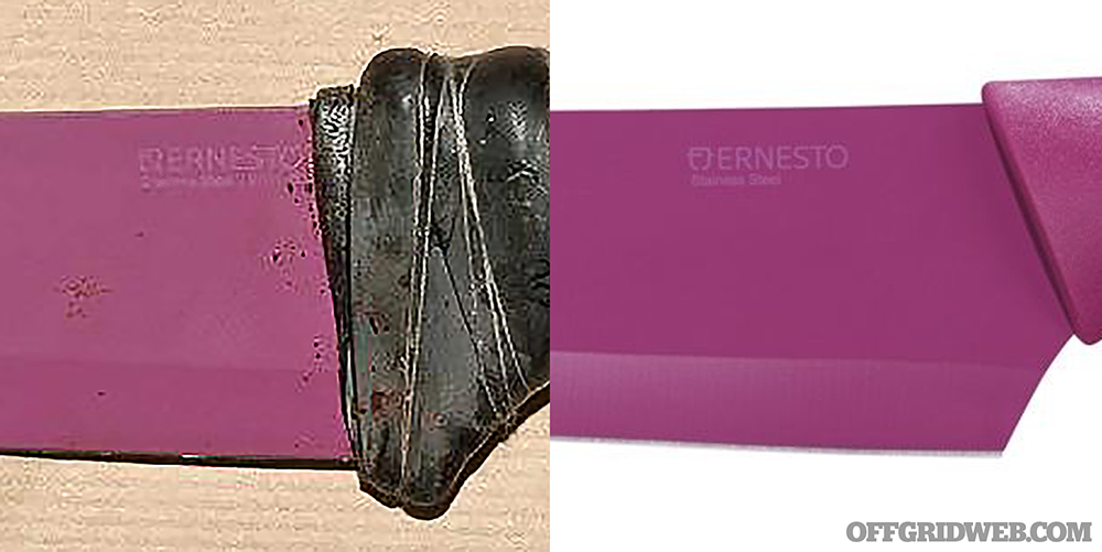 Closer examination of the text on the side of the blade shows what appear to be two words below the Ernesto logo. Limited resolution and quality of the evidence photo make these words hard to read, but they appear to match the placement of the words “Stainless Steel” seen in the product photo.