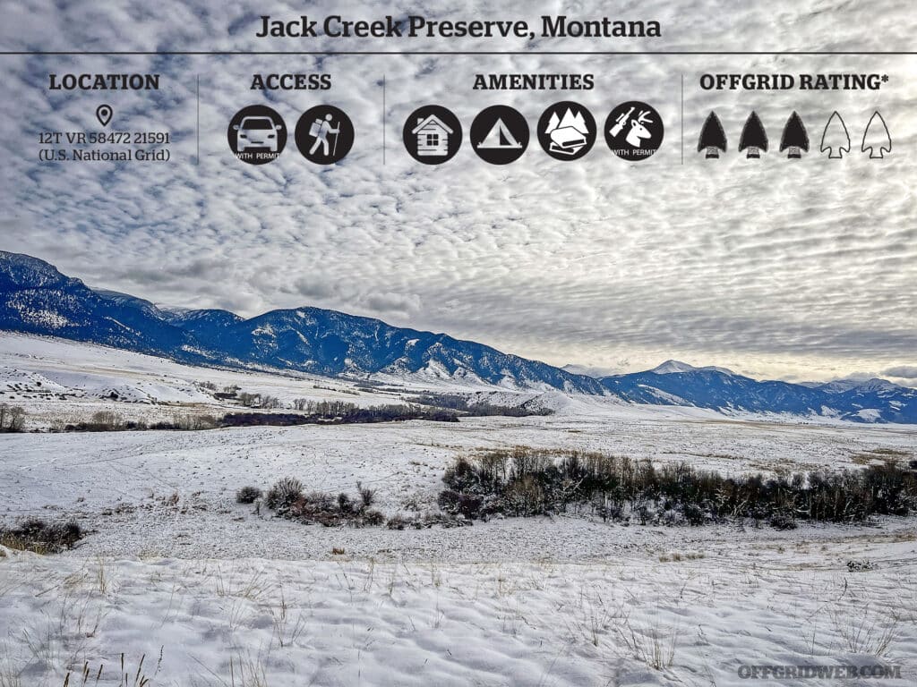 Survival Readiness: Travelers to Jack Creek Preserve should be prepared for a semi-remote experience, where natural beauty comes with inherent challenges. Weather in the Madison Mountains can change rapidly, with sudden snow or storms even in summer months, so proper layering and navigation tools are essential. Wildlife encounters are likely, as grizzly bears, moose, and mountain lions inhabit the area, making bear spray and situational awareness critical. Since access is controlled by a private road requiring a permit, visitors must plan ahead to avoid being turned away. Trail users should expect rugged conditions with limited cell service, carrying sufficient food, water, and first aid. Hunters and camp participants are provided structured resources, but independent visitors need to approach the preserve as an off-grid zone where self-reliance and outdoor competency are key to both safety and enjoyment.