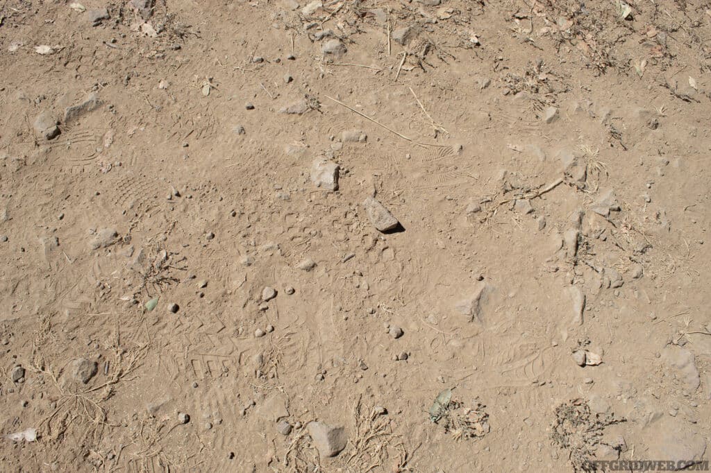Above: There are multiple tread patterns in this photo, but knowing which one is yours will help you follow the right trail. Tracking in the dust like this can be more difficult than tracking in a medium that is moist.