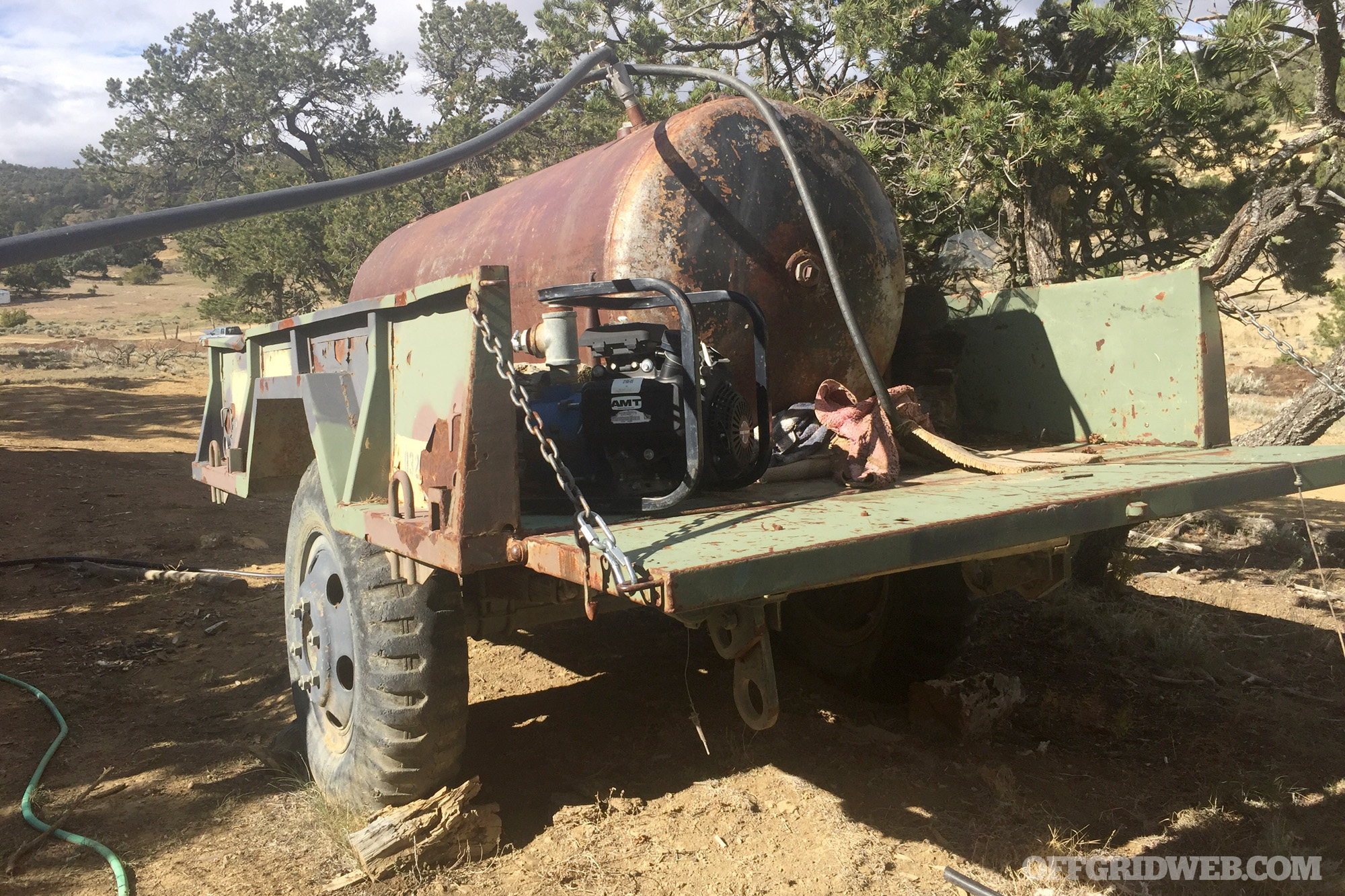 Here’s a portable “water buffalo” trailer which we can tow somewhere to either collect or deliver water. Note the small gas-powered pump in the bed next to the tank. We currently use this to water a garden, so it’s permanently parked there.