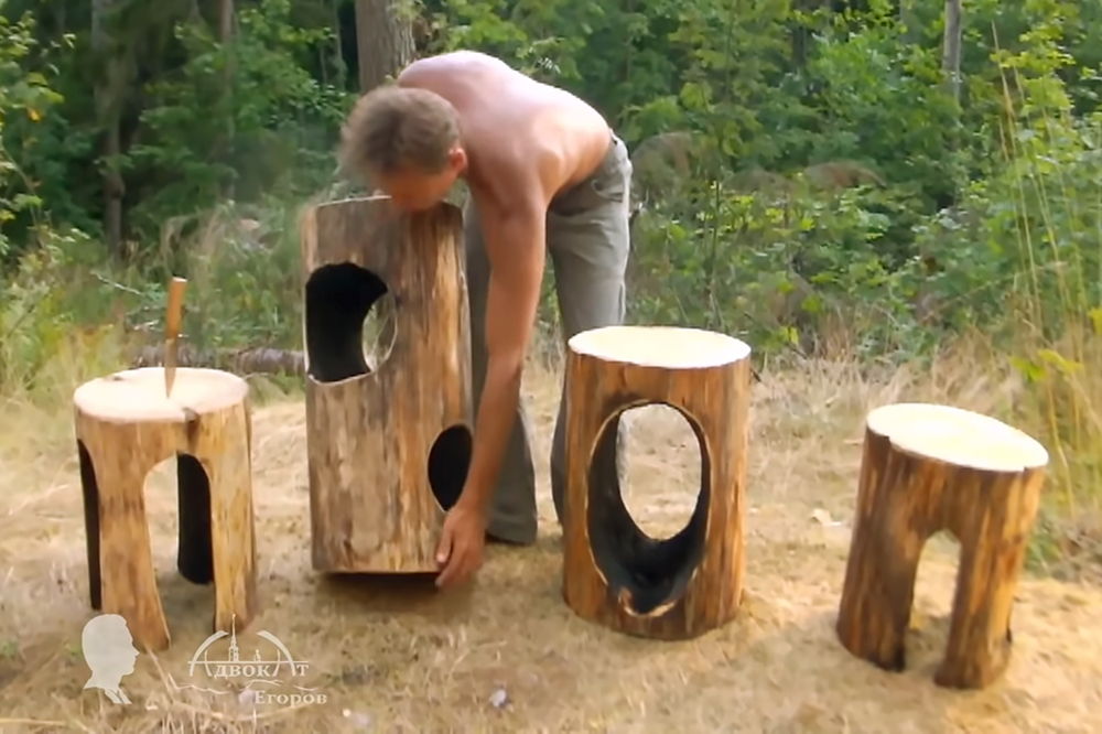 A Russian YouTuber known as Advoko MAKES recently posted a two-part English-dubbed video series that shows how to use selective cutting, drilling, and burning to create “fire-carved” log furniture for your campsite. This process removes wood to dramatically lighten the logs, and creates cavities that can be used for storage or decoration.