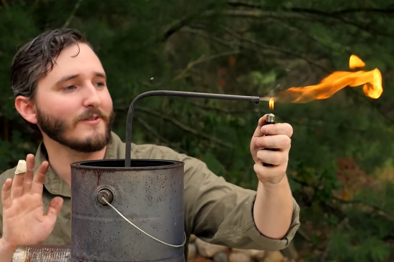 NightHawkInLight takes the experiment to the next level by trapping this wood gas in a way that pulls out the soot and other impurities. He does this by passing it through a tank of water and allowing the bubbles to rise into a sealed container, then waiting for the smoke to settle and the gas to turn clear. Submerging the tank then pressurizes the gas enough that it can be released through a valve as needed. It’s certainly not as simple as grabbing a pre-filled propane tank before your next camping trip, but it’s also free and nearly-unlimited, unlike commercially-refined fuels.