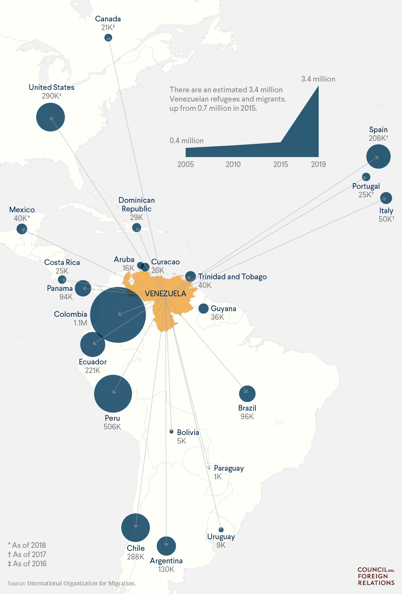 The following infographic from the Council on Foreign Relations shows the quantity and destinations of Venezuelan refugees. It was created based on data from the International Organization for Migrants, a division of the United Nations. You can download a full-size version of this graphic here.