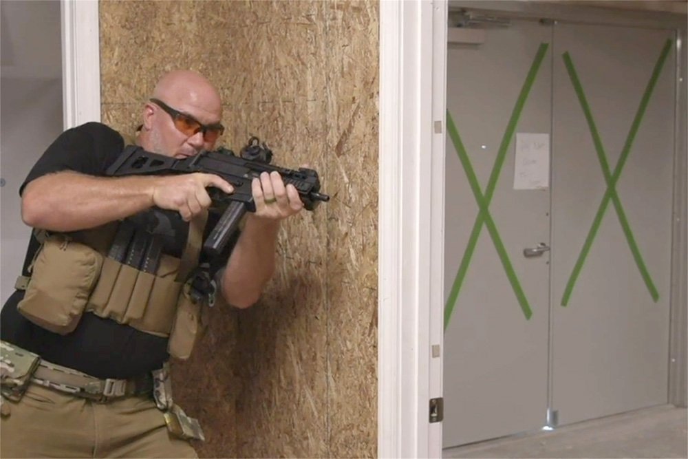 If you want to clear your house safely, you shouldn’t be stumbling haphazardly into rooms and spinning around. You should be methodically checking corners before moving into each room. There are a few ways to accomplish this, as Brokos explains. First is the Deliberate Pie method, which slowly “slices the pie” while moving around a doorway to slowly check all angles. Second is what Brokos calls Eating the Door, a method that’s faster and more dynamic but relies on the same corner-center-corner progression.