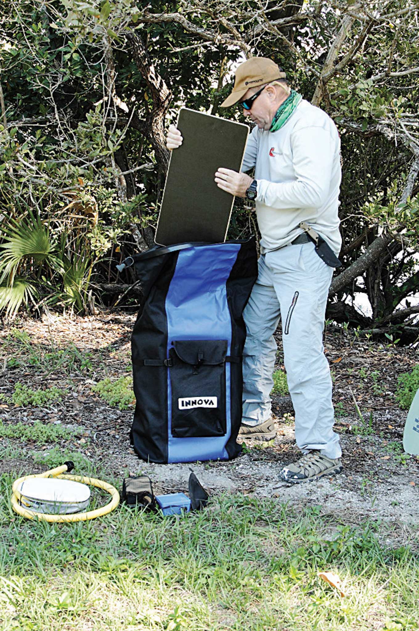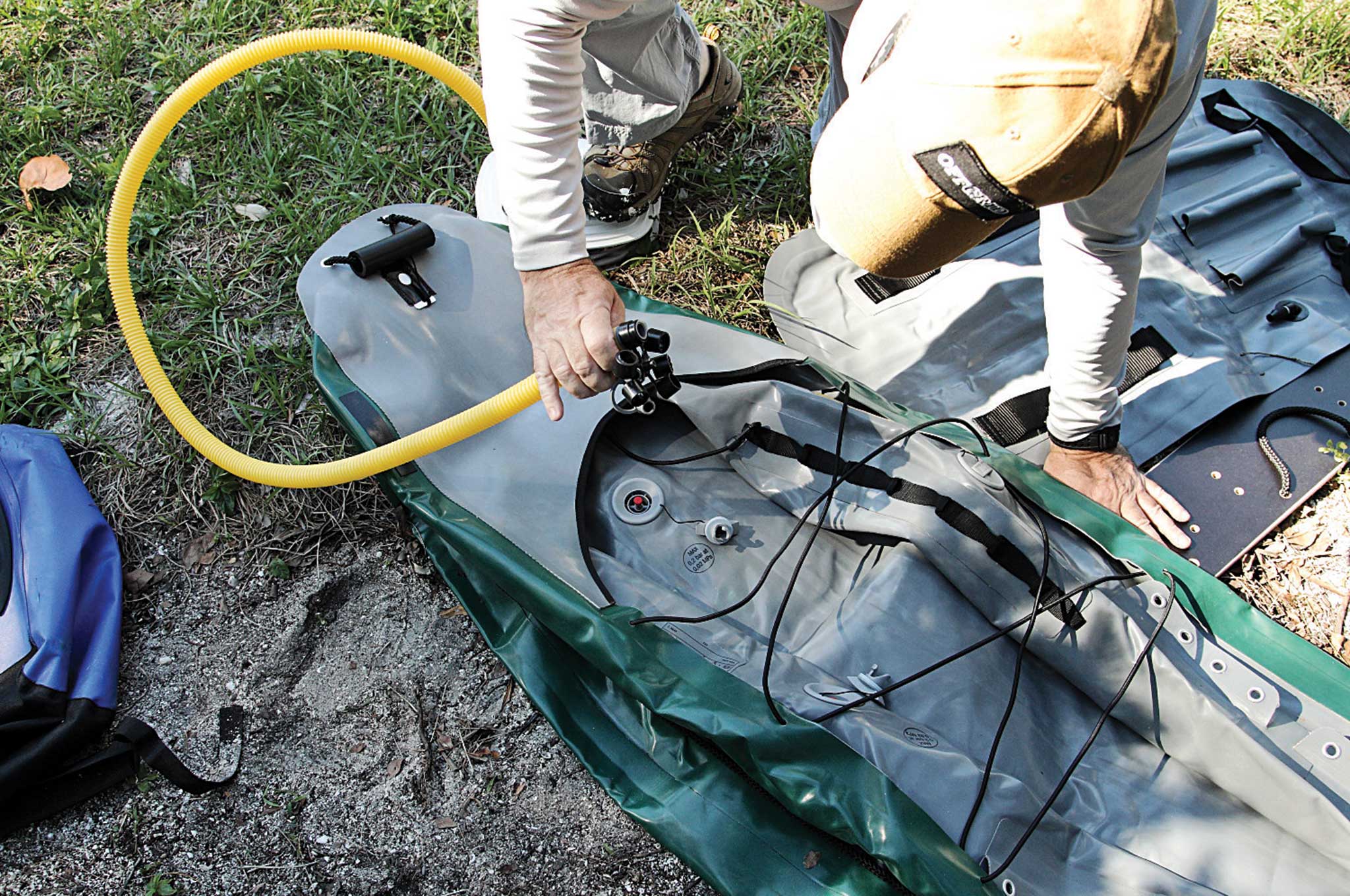 We needed to lay out, organize, orient, partially inflate, and assemble the inflatable seat, not to mention set up the tracking fin and floorboards for standing. There was also the orientation of deck fittings; we secured two evenly spaced fore and aft deck boards for attaching a rod holder or optional navigational electronics.