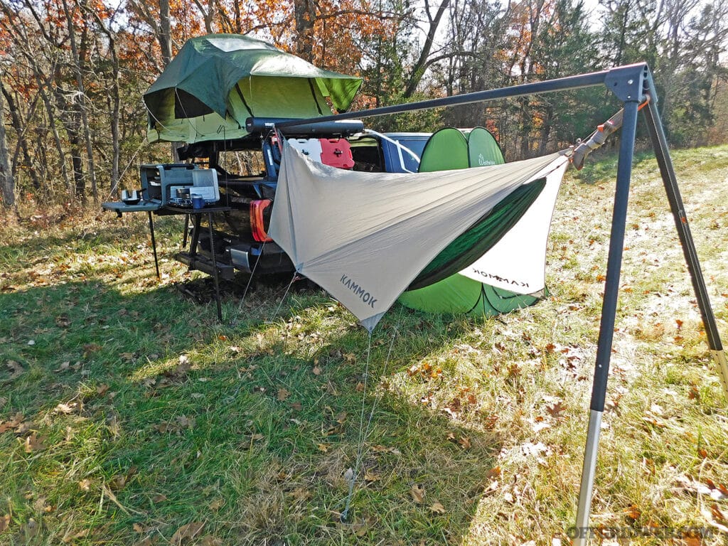 As one final bonus to the mobile base camp, for no other reason than I love relaxing in a hammock, I added a Kammok Outpost Bundle. The lightweight, aluminum frame consists of an A-frame on one end and attaches to the Yakima crossbar on the other. Hanging in between, I use the Mantis Hammock Tent, which can simply be a peaceful place to relax or a secondary tent complete with a rainfly and an integrated insect net if I have an extra person in my camp (of course, within the weight limits of the overall system). It holds up to 500 pounds, is a quick and easy setup, and is my favorite spot to relax after a hike or a ride.