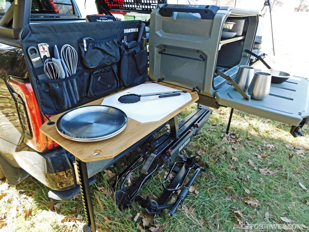 Again, staying on brand, the Yakima EXO OpenRange Deluxe caught my attention and has become my camp kitchen. This system lives on the receiver hitch Swing Base and Top Shelf at the back of my truck. Anyone who has carried cargo at the receiver hitch knows the frustration that comes when you need to access the rear of the vehicle. The Swing Hitch allows me to keep everything secure and easily swing it out of the way of the tailgate for easy access to the truck bed. The Top Shelf attached to the Swing Hitch provides another level of transportation options and storage. It is common to see gear lockers or bike racks on the Top Shelf. For me, it keeps the kitchen system at a workable height when I set it up.